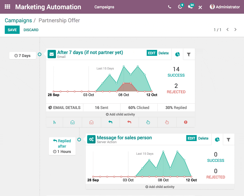Създаването на многоетапна кампания с няколко пътя е толкова лесно в Одоо. Добавете нови действия и изберете времеви спусъци директно във вашия работен процес. Стартирайте всяко действие, от което се нуждаете, за да рационализирате работния си процес.