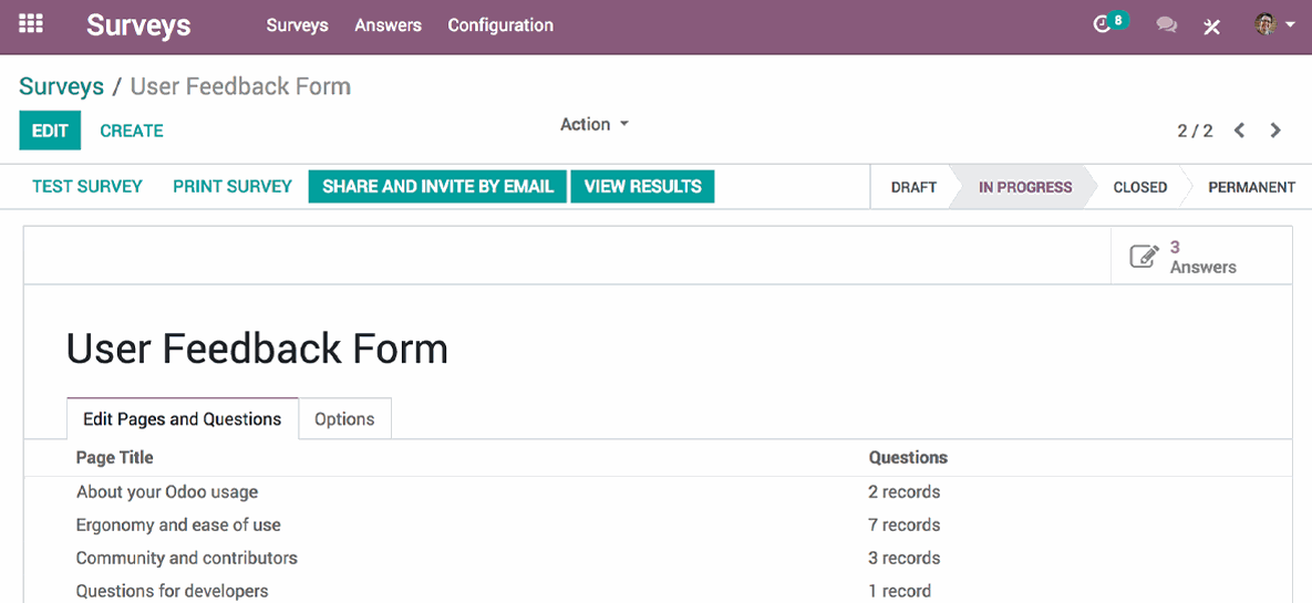 Още от самото начало, благодарение на изключително удобния за потребителя интерфейс, Одоо Проучвания ви позволява да създавате и редактирате анкети без усилие. Реагирайте на вашите маркетингови нужди и предоставяйте проучвания по всяко време.